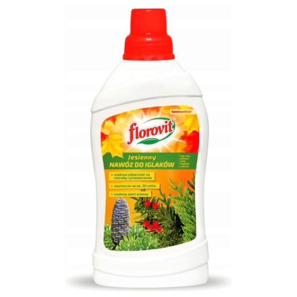 Florovit jesienny nawóz w płynie został dostosowany do zapotrzebowania pokarmowego drzew i krzewów iglastych, takich jak: cis, choina, cyprysik, cypryśnik, daglezja, jałowiec, jodła, sosna, metasekwoja, modrzew, świerk, tuja i inne. Nawóz ten zawiera odpowiednio dobrane składniki odżywcze, wspomagające mechanizmy drewnienia, co chroni iglaki przed przemarzaniem.