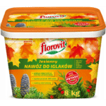 Florovit jesienny nawóz granulowany do iglaków jest przeznaczony do posypowego nawożenia drzew i krzewów iglastych, pomagając w ich właściwym przygotowaniu do okresu zimowego. Zawiera składniki wspomagające mechanizmy drewnienia, chroniąc iglaki przed wymarzaniem. Zwiększona zawartość potasu i fosforu podnosi odporność na przymrozki oraz korzystnie wpływa na gospodarkę wodną roślin. Nawóz można stosować jesienią, a jeśli nie został użyty, także wczesną wiosną, tuż przed rozpoczęciem wegetacji, co poprawia warunki wzrostu i rozwoju roślin wiosną.